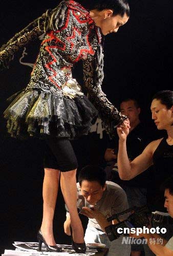 7月1日晚,“北京凱萊希模特學(xué)校2008年畢業(yè)匯報(bào)表演”在北京舉行。來自美國芝加哥大學(xué)博士Angela Zito編導(dǎo)創(chuàng)意的高跟鞋藝術(shù)秀別具特色,13位女模特,在中國傳統(tǒng)文士的書桌上表演走,坐,躺。男同學(xué)的加入令高跟鞋展現(xiàn)出男性和女性之間糾結(jié)的關(guān)系。名模陳娟紅最后登上書桌,穿上一雙鞋跟已經(jīng)被刻上圖章的高跟鞋,把圖章蓋在由這次活動(dòng)參與人員提供的照片上。這些照片代表著人們愿意重新體味過去的生活情景,該怎樣面對記憶,是把他們?nèi)釉谝贿厜m“封”,還是不斷地重新“開”啟,探究著占有的象征,在現(xiàn)世和回憶之間的重新定位。圖為名模陳娟紅書桌上展示高跟鞋藝術(shù)秀。中新社發(fā) 錢興強(qiáng) 攝