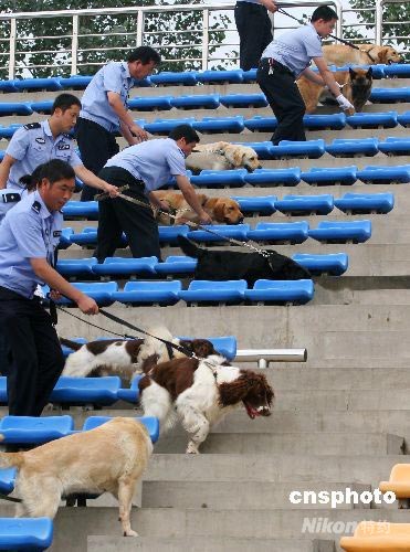 圖為警犬在觀眾看臺進(jìn)行模擬搜爆演練。 中新社發(fā) 富田 攝