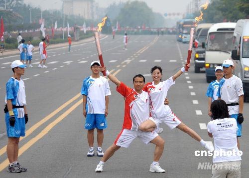 楊凌火炬手孟月婷和史建新傳遞火炬時(shí)擺出優(yōu)美造型。 中新社發(fā) 廖攀 攝