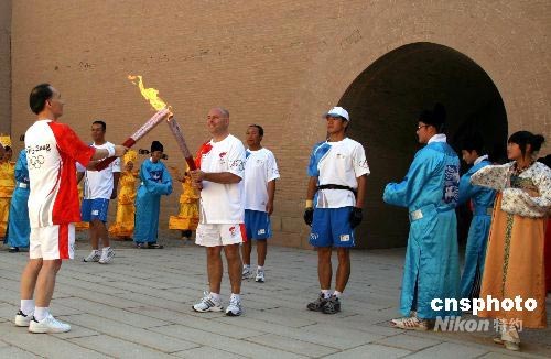 韓國籍火炬手李賢求(左一)和德國籍火炬手羅曼在嘉峪關(guān)關(guān)城內(nèi)交接火炬。 中新社發(fā) 周兆軍 攝