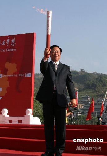 在奧運(yùn)火炬起跑儀式上,甘肅省委書記陸浩高舉火炬向現(xiàn)場(chǎng)民眾展示。 中新社發(fā) 周兆軍 攝