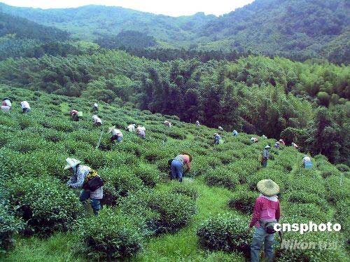 七月間正值臺(tái)灣阿里山地區(qū)采茶季節(jié),大清早開(kāi)始工作的茶農(nóng)在茶園采茶。中新社發(fā) 徐長(zhǎng)安 攝