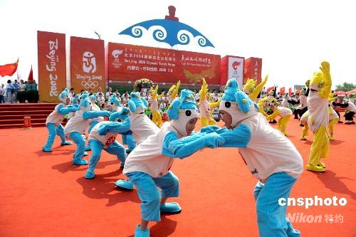 7月8日,奧運(yùn)火炬在內(nèi)蒙古呼和浩特市傳遞。蒙古族是擅長(zhǎng)摔跤的民族,扮成福娃的當(dāng)?shù)睾⑼谶M(jìn)行“摔跤角力”表演。中新社發(fā) 廖攀 攝