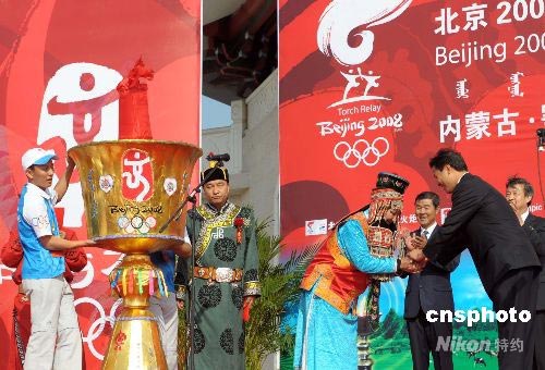 在成吉思汗陵舉行的起跑儀式上,鄂爾多斯蒙古族民眾向北京奧組委贈(zèng)送自己手工縫制的奧運(yùn)圣燈。中新社發(fā) 廖攀 攝