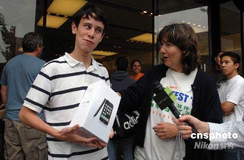當(dāng)?shù)貢r間7月11日上午,上千名顧客在加州帕薩迪納市的一家蘋果專賣店排隊(duì)搶購新上市的3G版IPHONE手機(jī),首位買到手機(jī)的顧客palmigiano得意洋洋地展示“戰(zhàn)利品”。中新社發(fā) 張煒 攝