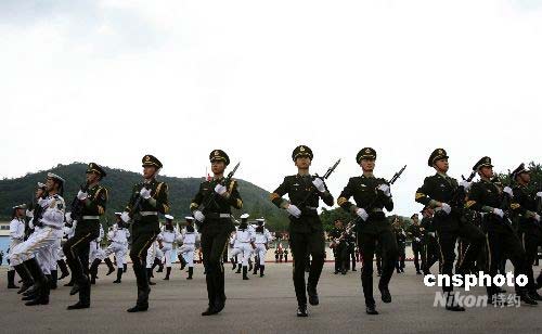 圖為駐港部隊(duì)槍械團(tuán)體操表演。中新社發(fā) 張勤 攝