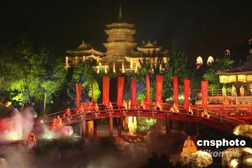 7月14日晚,一部名為《禪宗少林》的音樂大典在河南登封的嵩山實(shí)景演出,參加演出的演員達(dá)600人!抖U宗少林》由著名音樂家譚盾擔(dān)任藝術(shù)總監(jiān)和音樂原創(chuàng),梅帥元任導(dǎo)演。演出地點(diǎn)位于距嵩山少林寺7公里處的一片峽谷中,分為《水樂》《木樂》《風(fēng)樂》《光樂》《石樂》五個(gè)樂章,吸引眾多游客觀看。該節(jié)目將成為中原文化旅游的一大亮點(diǎn)。中新社發(fā) 趙雋 攝