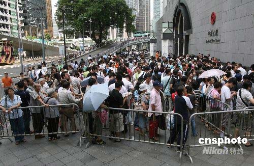 七月十五日,數(shù)千香港市民在中銀香港總部外等待領取奧運紀念鈔票購物憑證。三百七十六萬張港幣奧運紀念鈔票十六日才發(fā)售,但在開售前的五十小時,已有數(shù)以千計的市民前往中銀相關分行外排隊等候。中新社發(fā) 武仲林 攝