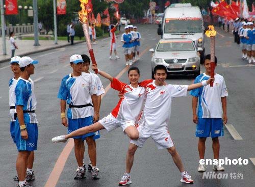 圖:奧運火炬吉林市傳遞 火炬手?jǐn)[出優(yōu)美造型