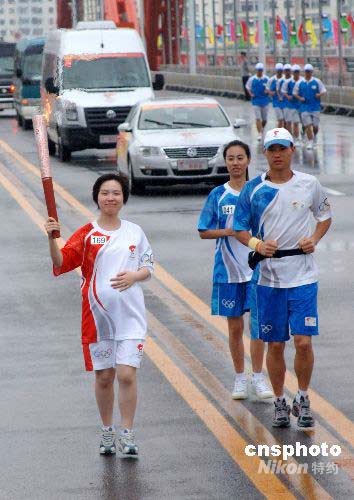 7月15日下午,奧運火炬在吉林市傳遞,已經(jīng)懷孕7個月的火炬手李圓傳遞火炬。 中新社發(fā) 廖攀 攝