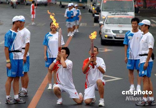 7月15日下午,奧運火炬在吉林市傳遞,火炬手閆智、劉賀交接火炬時同時親吻火炬。 中新社發(fā) 廖攀 攝