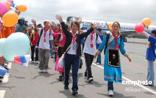 7月17日下午,首批中國(guó)四川地震災(zāi)區(qū)中小學(xué)生療養(yǎng)團(tuán)的364名孩子們抵達(dá)俄羅斯濱海區(qū)符拉迪沃斯托克(海參崴),進(jìn)行為期3周的康復(fù)療養(yǎng)。圖為第一次踏上了俄羅斯土地的災(zāi)區(qū)孩子們臉上露出了久違的笑容。中新社發(fā) 田冰 攝