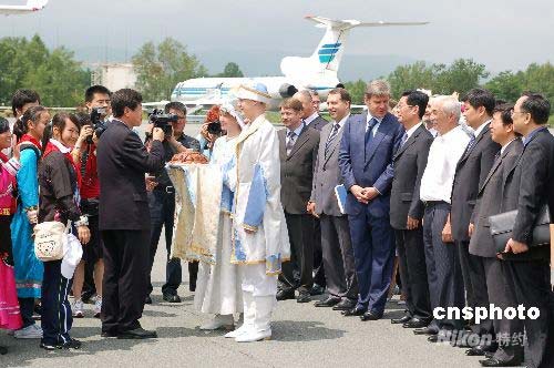 圖為中國(guó)駐俄羅斯大使劉古昌、俄濱海邊疆區(qū)行政長(zhǎng)官達(dá)里金、俄總統(tǒng)駐遠(yuǎn)東區(qū)副代表捷列霍夫等專(zhuān)程到機(jī)場(chǎng)迎接。中新社發(fā) 田冰 攝