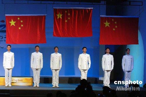 北京奧運(yùn)頒獎志愿者在北京展示升旗手服裝,在體現(xiàn)中國傳統(tǒng)文化的同時又不失陽剛之氣。中新社發(fā) 王東明 攝