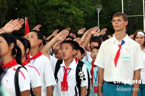 圖為升旗儀式上的中國(guó)地震災(zāi)區(qū)中小學(xué)生和他們的俄羅斯輔導(dǎo)員。中新社發(fā) 田冰 攝