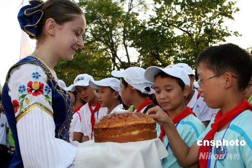 圖:俄羅斯傳統(tǒng)禮儀迎接中國地震災區(qū)孩子