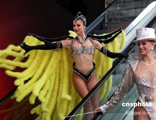 法國巴黎著名的麗都夜總會的舞娘在巴黎老佛爺百貨男裝館,為游人和顧客獻(xiàn)上風(fēng)情萬種的火辣演出。中新社發(fā) 王倩 攝