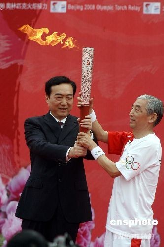 7月27日,河南省委副書記陳全國(guó)將火炬交于河南洛陽第一棒火炬手張海(右)手中,張海是當(dāng)代中國(guó)書法掌門人。當(dāng)日,北京奧運(yùn)接力到河南省洛陽市。中新社發(fā) 慎重 攝