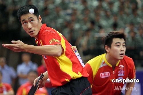 7月28日晚,中國乒乓球隊備戰(zhàn)奧運熱身賽男團決賽在無錫體育中心進行。男隊設(shè)4支隊伍進行淘汰賽,女隊分4隊進行單循環(huán)比賽,并設(shè)男子單打擂臺賽。最終王皓、馬琳、王勵勤組成的男一隊苦戰(zhàn)5局奪得男子團體冠軍。圖為王勵勤、王皓在雙打比賽中。中新社發(fā) 盛佳鵬 攝