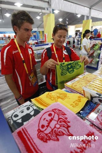 7月29日,北京奧運村購物區(qū),來自波蘭的選手在挑選帶有“福娃”圖案的毛巾。中新社發(fā) 杜洋 攝