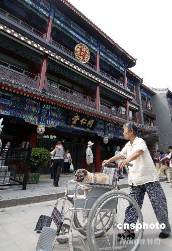 7月30日,一位老人到重新開業(yè)的大柵欄街遛狗。當(dāng)日,有著近500年歷史的北京大柵欄商業(yè)街完成近年來最大規(guī)模改造后重張迎客。中新社發(fā) 王東明 攝