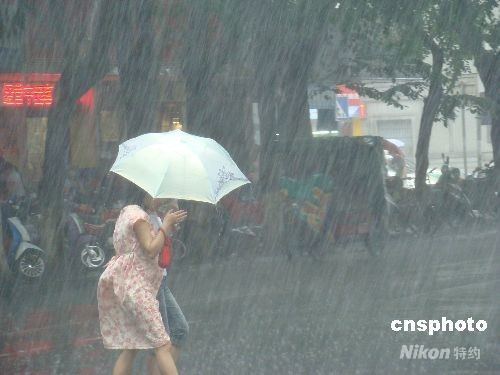 8月6日中午,?谑軣釒эL(fēng)暴“北冕”影響,不時下起瓢潑大雨。據(jù)海南省氣象臺預(yù)報,當(dāng)日白天到夜間,海南島除西部外均將有大到暴雨。圖為行人艱難地在雨中行走。中新社發(fā) 付美斌 攝