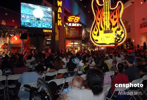 當(dāng)?shù)貢r(shí)間8月8日晚,上千名當(dāng)?shù)厥忻窈陀慰途奂诤萌R塢環(huán)球影城步行街,觀看北京奧運(yùn)會(huì)開幕式盛況,現(xiàn)場(chǎng)不時(shí)傳出掌聲和驚呼聲。中新社發(fā) 張煒 攝