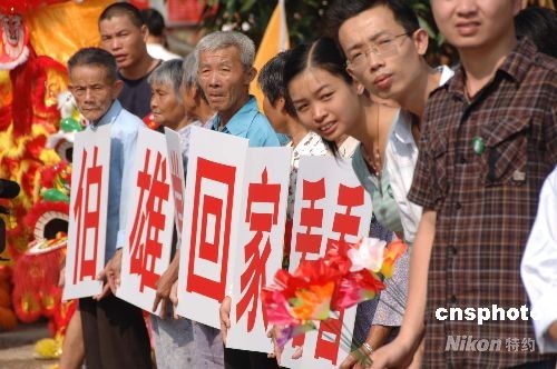 圖為鄉(xiāng)親打出“伯雄常回家看看”的橫幅。中新社發(fā) 鄭祚聲 攝