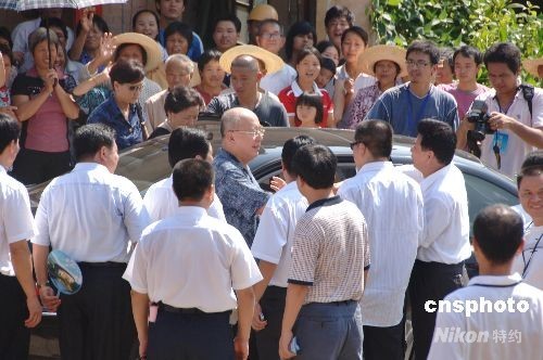 八月十四日下午,中國(guó)國(guó)民黨主席吳伯雄在福建永定縣的高北土樓群參觀(guān)完后,上車(chē)前與鄉(xiāng)親話(huà)別,隨后乘車(chē)趕赴廈門(mén)。中新社發(fā) 鄭祚聲 攝