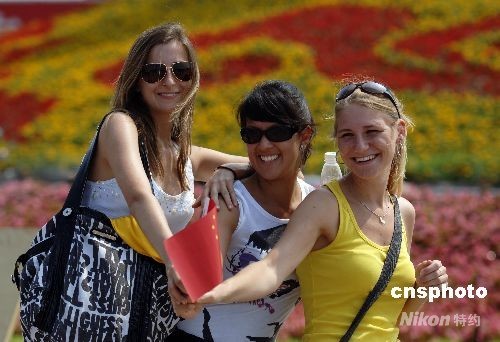 8月18日,北京晴空萬里,三位外國靚女在天安門廣場留影。中新社發(fā) 王東明 攝