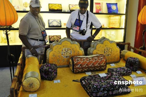 8月21日,北京故宮博物院的“皇家飾品”商店迎來了海內(nèi)外顧客。商店內(nèi)銷售的均為仿清朝宮廷風(fēng)格的各式靠墊、睡衣等絲綢錦緞手工制品。美國游客安東尼和查里對商店里清代皇家風(fēng)格的刺繡紋飾擺件情有獨鐘。中新社發(fā) 王宇婷 攝