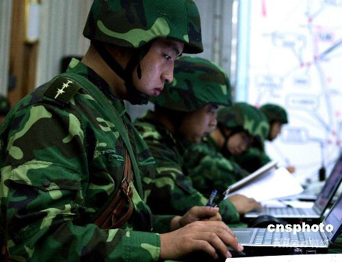 中國人民解放軍“勵(lì)兵--2008”演練8月26日拉開帷幕。當(dāng)日上午濟(jì)南軍區(qū)某機(jī)械化步兵旅指揮機(jī)關(guān)向所屬部隊(duì)下達(dá)了進(jìn)入戰(zhàn)備狀態(tài)命令,部隊(duì)迅速進(jìn)入戰(zhàn)位嚴(yán)整以待,戰(zhàn)備狀態(tài)將隨時(shí)升級(jí)。中新社發(fā) 宋吉河 攝
