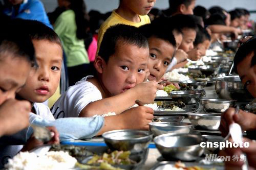 9月1日,四川阿壩州汶川地震災(zāi)區(qū)的600余名學(xué)生在瀘州市第十中學(xué)校經(jīng)過(guò)兩周的環(huán)境適應(yīng)后,正式進(jìn)入過(guò)渡復(fù)課,圖為孩子們正在集體用餐,三菜一湯,吃得津津有味。中新社發(fā) 牟科 攝