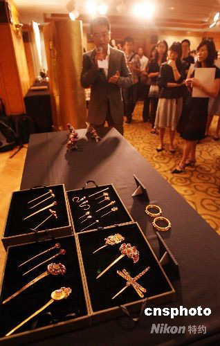 九月十日,香港國際藝展公司向傳媒展示一套華美精巧的黃金發(fā)飾,估計(jì)拍賣價(jià)在八百萬港元。該公司主辦的 “2008香港國際古玩及藝術(shù)品博覽會(huì)”將在十月四日至七日在會(huì)展中心舉行。中新社發(fā) 洪少葵 攝