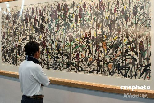 9月10日,2008上海藝術(shù)博覽會(huì)開幕。本屆藝博會(huì)吸引了來自中國、美國、法國等20個(gè)國家的140余家優(yōu)秀畫廊前來參展。圖為吳冠中代表作《高粱》吸引參觀者。中新社發(fā) 湯彥俊 攝