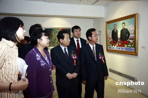 由中華人民共和國文化部、朝鮮民主主義人民共和國文化省主辦,中國對(duì)外藝術(shù)展覽中心承辦的“為紀(jì)念朝鮮民主主義人民共和國成立六十周年-朝鮮美術(shù)展”18日在北京中外博藝畫廊開幕。此次展覽展示了朝鮮著名功勛藝術(shù)家、人民藝術(shù)家、以及青年畫家創(chuàng)作的朝鮮畫、油畫、版畫、刺繡等美術(shù)作品五十九幅。圖為出席開幕式的中華人民共和國文化部文化部副部長趙少華(右四)、朝鮮民主主義人民共和國駐華大使崔鎮(zhèn)洙(右三)等在觀展。中新社發(fā) 邢利宇 攝