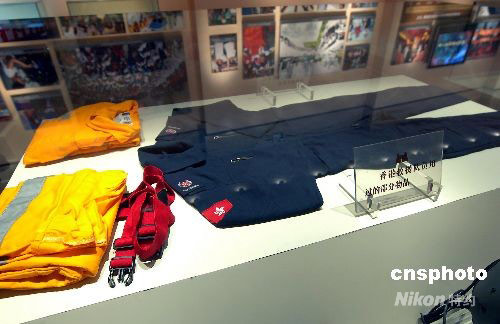 中國(guó)汶川大地震救災(zāi)工作中,香港抗震救災(zāi)救援隊(duì)隊(duì)員穿過(guò)的救災(zāi)服裝在展會(huì)柜臺(tái)中展出。