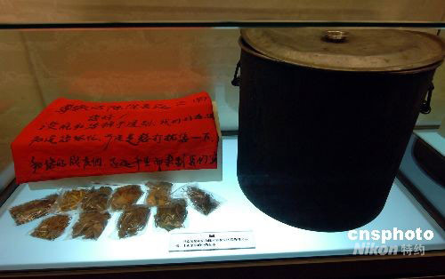 圖為由抗震英雄“神軍醫(yī)”--云南邊防總隊(duì)醫(yī)院院長(zhǎng)陳本善使用的中草藥(標(biāo)本)和熬制中草藥湯劑的大鍋(文物)。中新社發(fā) 鄒憲 攝