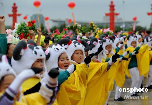 9月22日,中央人民政府向?qū)幭幕刈遄灾螀^(qū)贈送民族團結(jié)寶鼎儀式在銀川舉行,當(dāng)?shù)厣倌陜和缱鳌把驅(qū)殞殹睔g迎中央代表團。中新社發(fā) 廖攀 攝