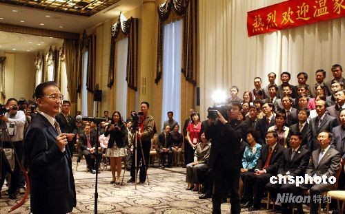 9月23日下午,抵達(dá)紐約的中國(guó)總理溫家寶與當(dāng)?shù)厝A人華僑、中國(guó)駐外機(jī)構(gòu)代表和留學(xué)生等見(jiàn)面。中新社發(fā) 李靜 攝