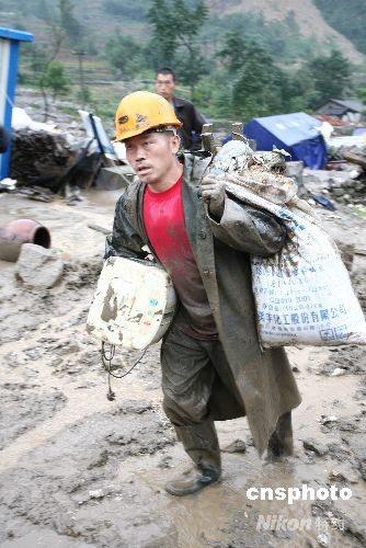 四川地震災(zāi)區(qū)北川羌族自治縣連降暴雨,遭泥石流襲擊,一批基礎(chǔ)設(shè)施被毀。圖為24日上午,擂鼓鎮(zhèn)麻柳灣村村民正在轉(zhuǎn)移。中新社發(fā) 蒲滔 攝