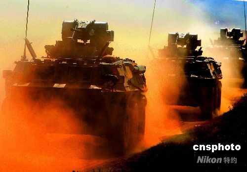 9月25日上午,中國(guó)人民解放軍“礪兵--2008”演習(xí)在塞北大漠展開(kāi)。這場(chǎng)演習(xí)是一場(chǎng)在復(fù)雜地形、復(fù)雜電磁環(huán)境、作戰(zhàn)信息“背靠背”情況下,跨軍區(qū)聯(lián)合、多兵種協(xié)同、陸航空一體、實(shí)兵檢驗(yàn)性戰(zhàn)術(shù)集團(tuán)立體機(jī)動(dòng)攻防戰(zhàn)斗演習(xí)。中新社發(fā) 宋吉河 攝