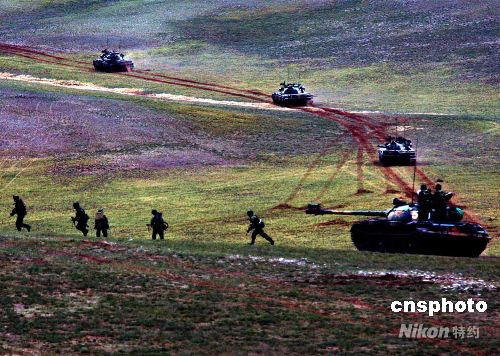 9月25日上午,中國人民解放軍“礪兵--2008”演習(xí)在塞北大漠展開。這場演習(xí)是一場在復(fù)雜地形、復(fù)雜電磁環(huán)境、作戰(zhàn)信息“背靠背”情況下,跨軍區(qū)聯(lián)合、多兵種協(xié)同、陸航空一體、實(shí)兵檢驗(yàn)性戰(zhàn)術(shù)集團(tuán)立體機(jī)動攻防戰(zhàn)斗演習(xí)。中新社發(fā) 宋吉河 攝
