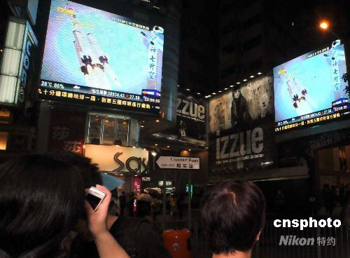 九月二十五日晚,中國載人太空船“神舟七號”在中國酒泉衛(wèi)星發(fā)射中心順利升空。圖為“神舟七號”升空相關(guān)新聞片段在香港銅鑼灣鬧市播放,吸引市民駐足觀看。中新社發(fā) 鄧慶樂 攝