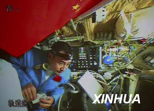9月26日23時01分,手持食品袋的航天員翟志剛在神舟七號飛船軌道艙內(nèi)進食(拍攝于北京航天飛行控制中心大屏幕)。新華社記者 查春明 攝