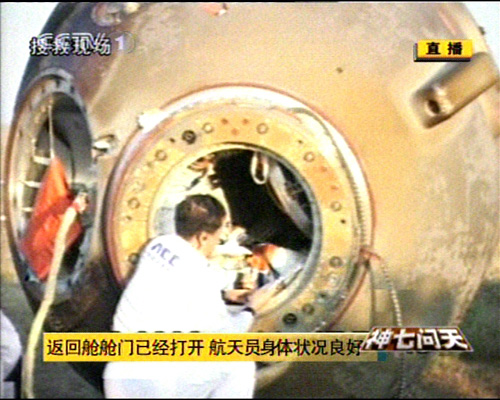 神舟七號飛船返回艙順利著陸,返回艙外觀檢查正常,搜救隊員按程序打開返回艙艙門,醫(yī)監(jiān)醫(yī)保人員檢查航天員身體狀況。經(jīng)醫(yī)監(jiān)醫(yī)保人員檢查,三名航天員身體狀況良好。三人面帶笑容。