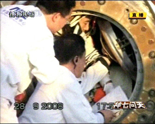 神舟七號飛船返回艙順利著陸,返回艙外觀檢查正常,搜救隊(duì)員按程序打開返回艙艙門,醫(yī)監(jiān)醫(yī)保人員檢查航天員身體狀況。經(jīng)醫(yī)監(jiān)醫(yī)保人員檢查,三名航天員身體狀況良好。三人面帶笑容。