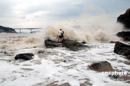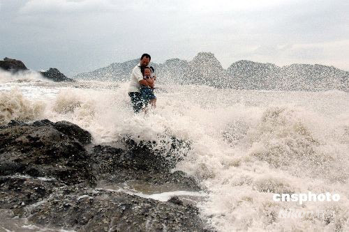 9月28日,受超強臺風(fēng)“薔薇”影響,浙江溫州市洞頭島海域已是波濤洶涌,海礁上掀起的巨浪高達(dá)10多米。下午2時許,一對外地父女在海邊游玩時不慎被突漲的潮水困在礁石上,隨時可能被海浪吞噬。正在海邊巡邏的洞頭邊防大隊官兵發(fā)現(xiàn)險情后,迅速展開緊急營救,成功將父女從海浪中安全救上岸。中新社發(fā) 吳水斌 攝