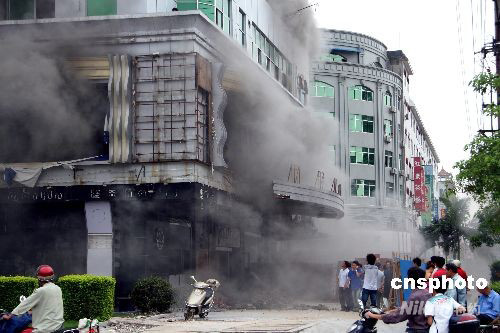 10月5日下午,廣西玉林市瑪田俱樂(lè)部在裝修過(guò)程中不慎起火,致使正在施工的21名工作人員被困火場(chǎng)。經(jīng)玉州消防大隊(duì)官兵20多分鐘奮力撲救,大火被撲滅,受困人員得以安全疏散。中新社發(fā) 吳海賢 攝