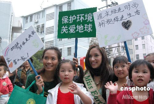 2007地球小姐世界冠軍杰西卡(中)、2006地球小姐季軍凱瑟琳與社區(qū)的孩子們在一起。 中新社發(fā) 劉建民 攝